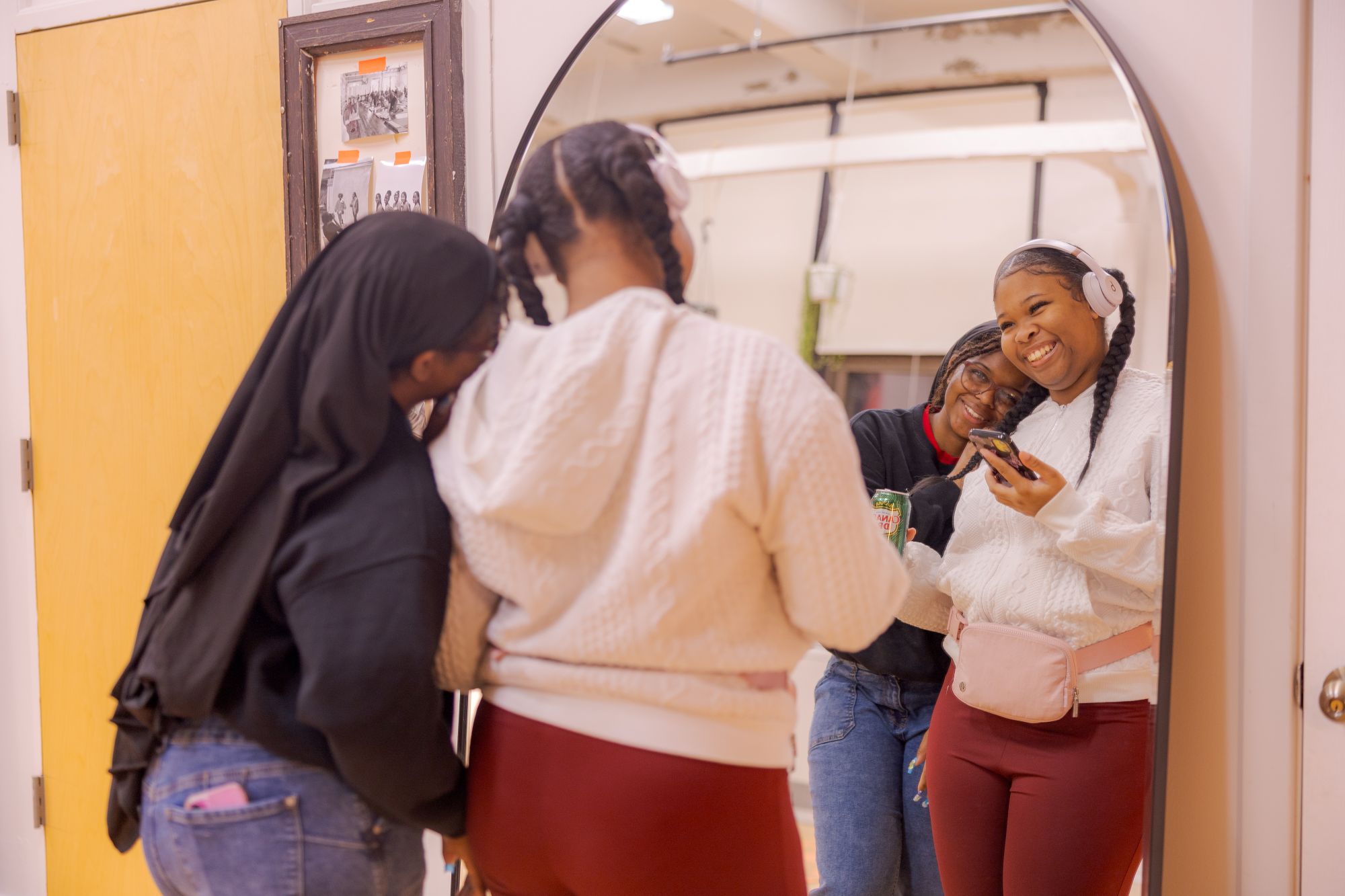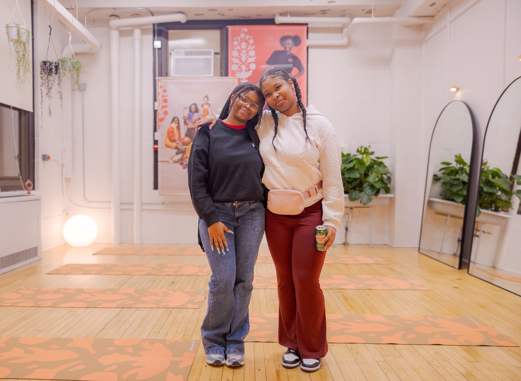 Inside, the new Wellness Center felt like a breath of fresh air — open and welcoming, filled with natural light that pours through tall windows to highlight the room’s 14-foot ceilings, touches of greenery, and warm lighting that softens every corner. Outfitted with stylish, thoughtfully chosen pieces and cozy furnishings, the center was designed to feel safe, soothing, and alive. It’s a space that welcomes not just movement but stillness — a place where girls can pause, stretch, breathe, and simply be. Located on the second floor of the historic Bok Building in South Philadelphia, the center offers a peaceful retreat within the city.